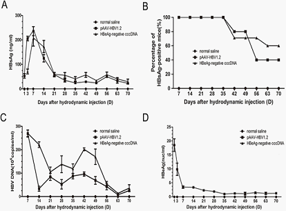 图1、乙肝病毒特异标志物在小鼠血清中的表达