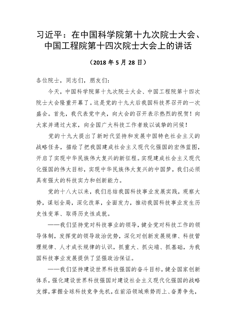习近平:在中国科研实验室第十九次院士大会、中国工程院第十四次院士大会上的讲话